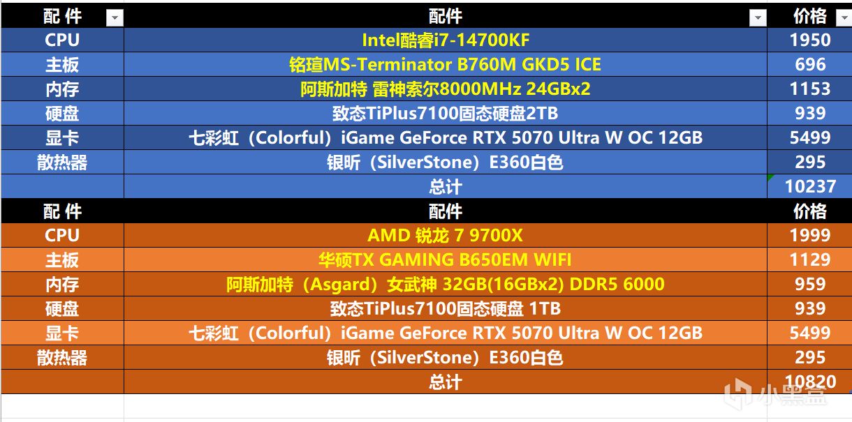 這裏拉出來兩套同價格有代表性的配置來給大家講講思路,配置分別爲intel 14700kf+銘瑄B760M+阿斯加特 雷神8000MHz高頻內存和AMD 9700X+華碩天選B650E+阿斯加特 女武神II 6000MHz C28內存,遊戲+生產力/純遊戲的配置。
