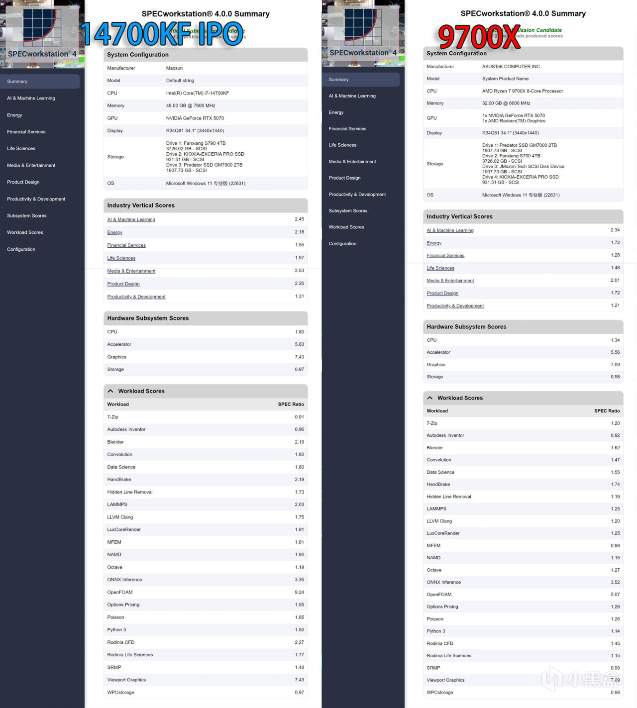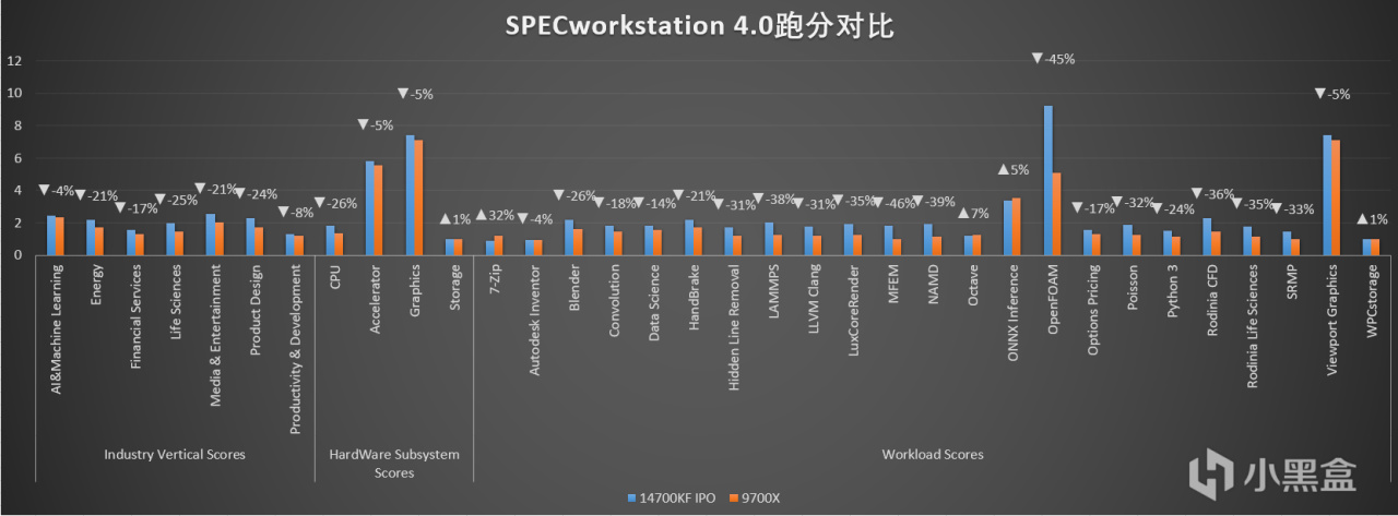 9700X在Storage、7-ZIP、Octave、ONNX Inference、WPCstorage項目上表現更好一些,不過14700KF IPO大部分項目更高,綜合平均表現高出9700X 19%。