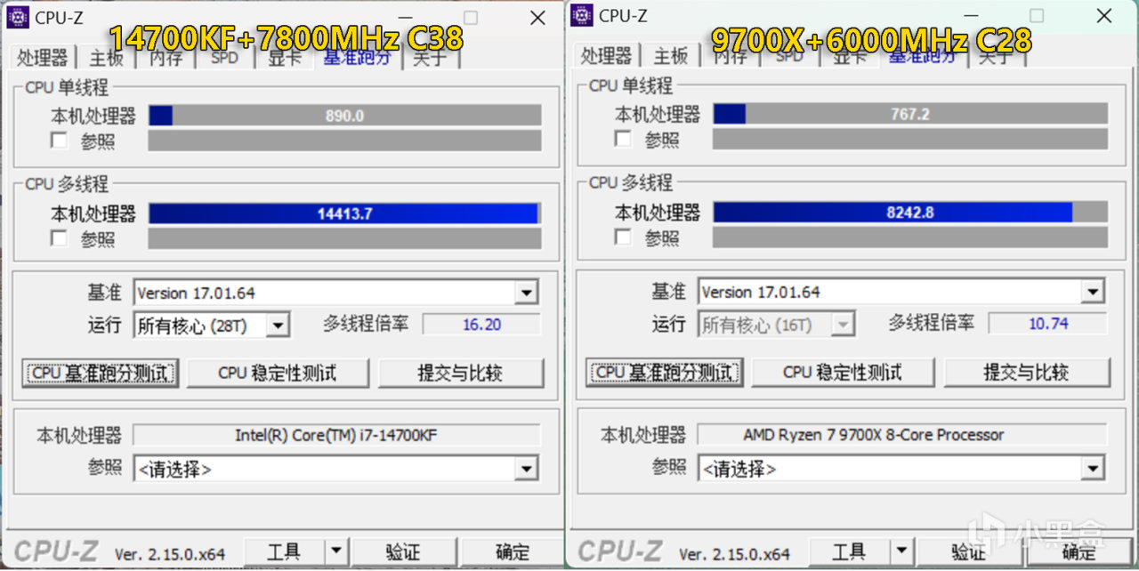 CPU-Z 基準跑分測試的表現與散熱表現、內存帶寬、主板供電穩定性相關,Intel 14700KF對散熱的需求更強,不過現在水冷都很便宜,跑分可以看出散熱供電均沒有瓶頸,正常發揮。