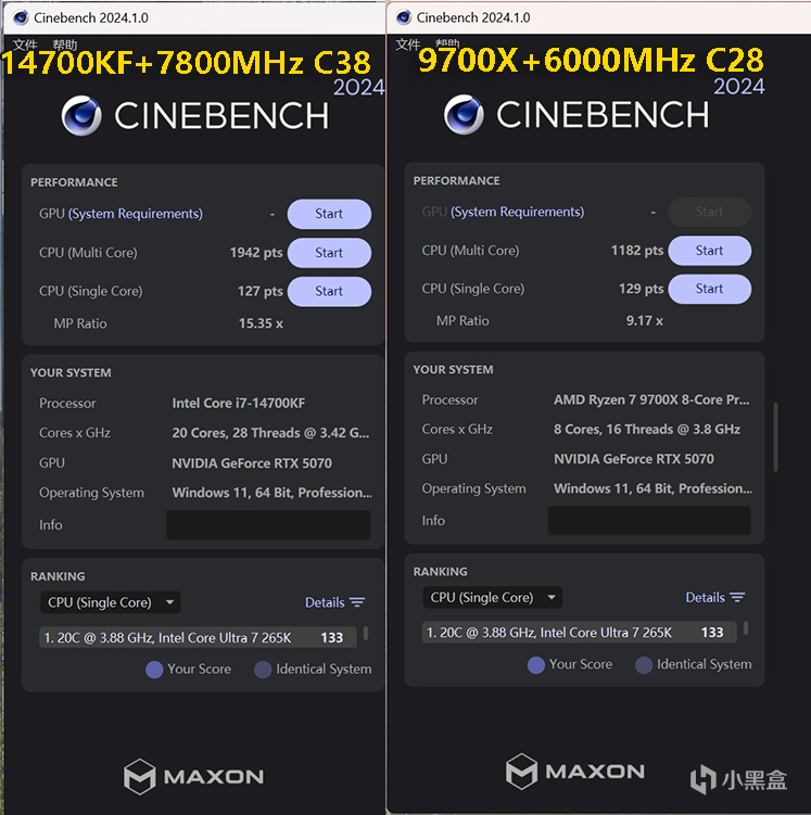 Intel 14700KF+7800MHz C38: 多核1942(+64.3%);單核127;