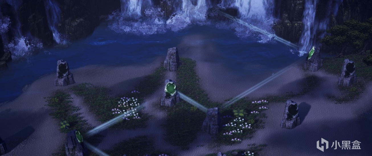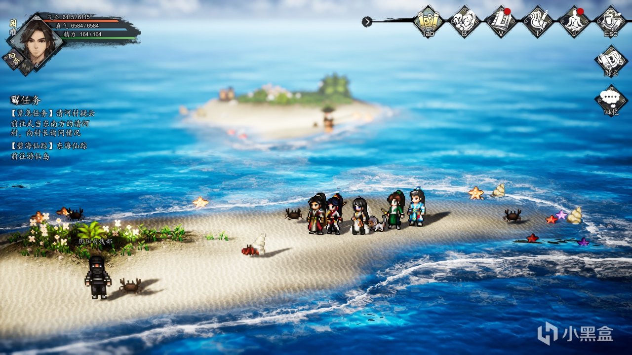 雖然這可能也是《逸劍風雲決》“碧海仙蹤”DLC新圖帶來的特性之一?東海之中的每個島嶼都有着不同的景象,即使有的島嶼上斜陽夕照,把海螺給映成便便,也還有其他的島嶼在努力發光發熱——比如我個人最喜歡的蟹島:這光,這水,能感受到這遊戲對HD-2D的運用越來越熟練了。