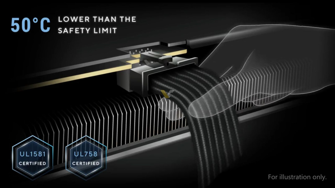 不过华硕不止步于此,设计上在铜点上镀金,其表示能将连接器温度降低至高10℃,这大概是受控测试下最大负载中实现的。此外,线缆还经过了额外的蚀刻处理器,华硕称这提高了安装时的灵活性。华硕表示,如果布线合理,这些线缆的运行温度还可以降低高达50℃。