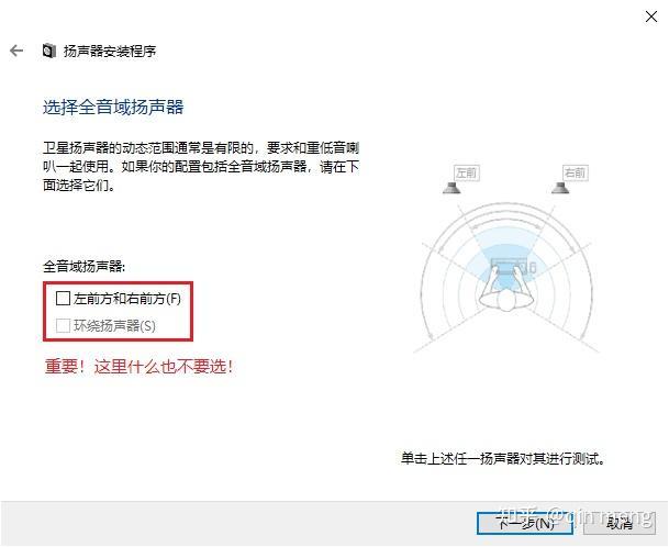 点击后,会进入一个配置向导,第一页选择立体声,关键是第二页,配置全音域扬声器。这里如果你选择了任意类型的全音域扬声器,那么低音管理选项就会替代低音增强选项了: