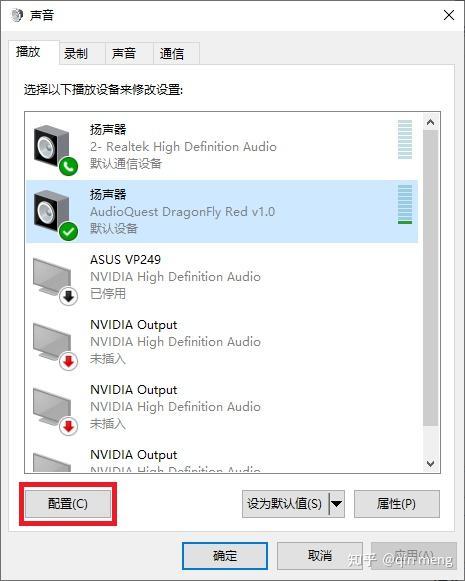 那么怎么设置扬声器类型呢,在这里,右键单击桌面小喇叭,选择声音,弹出窗口选择播放选项卡,选择你的播放设备,点击左下角的配置按钮: