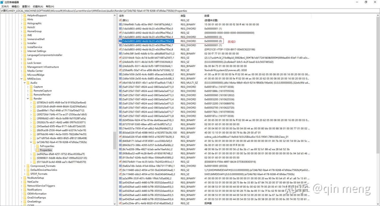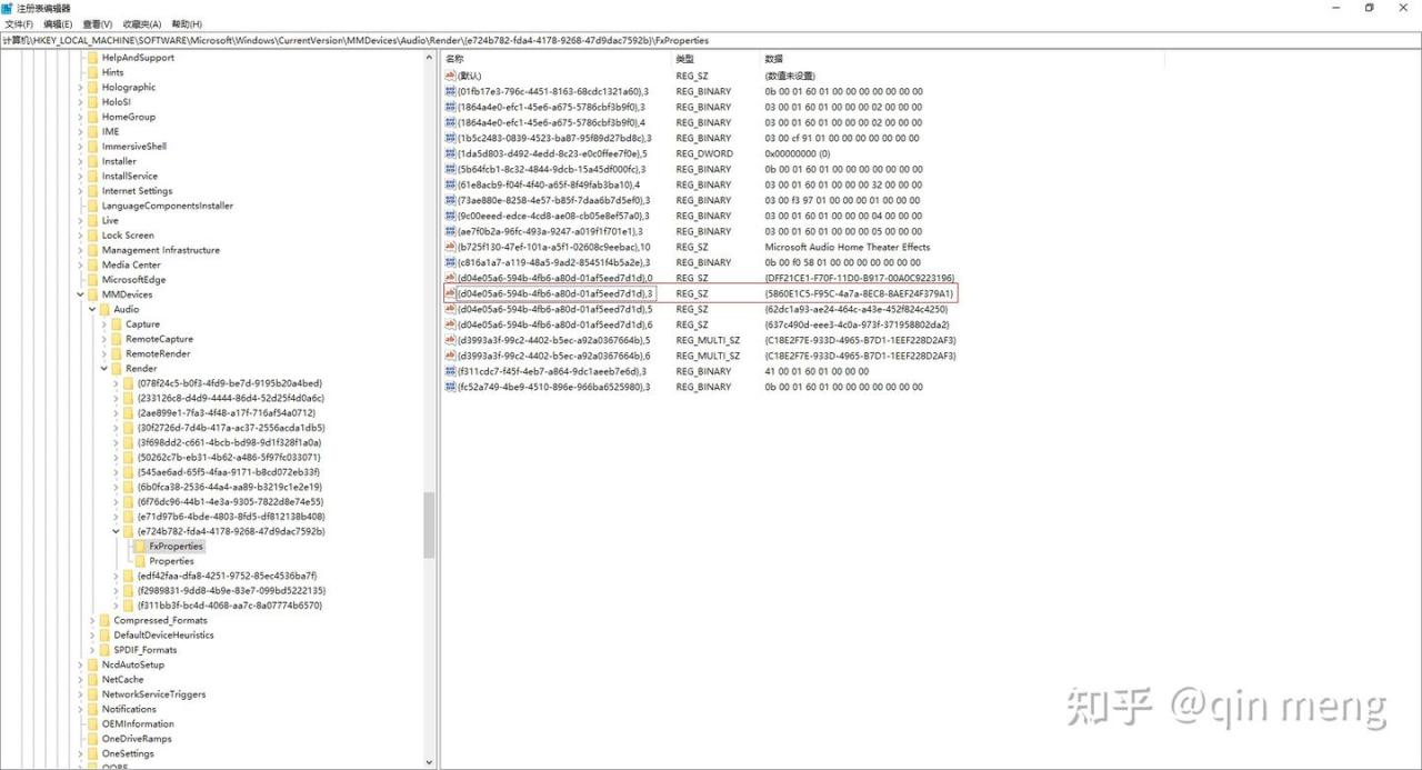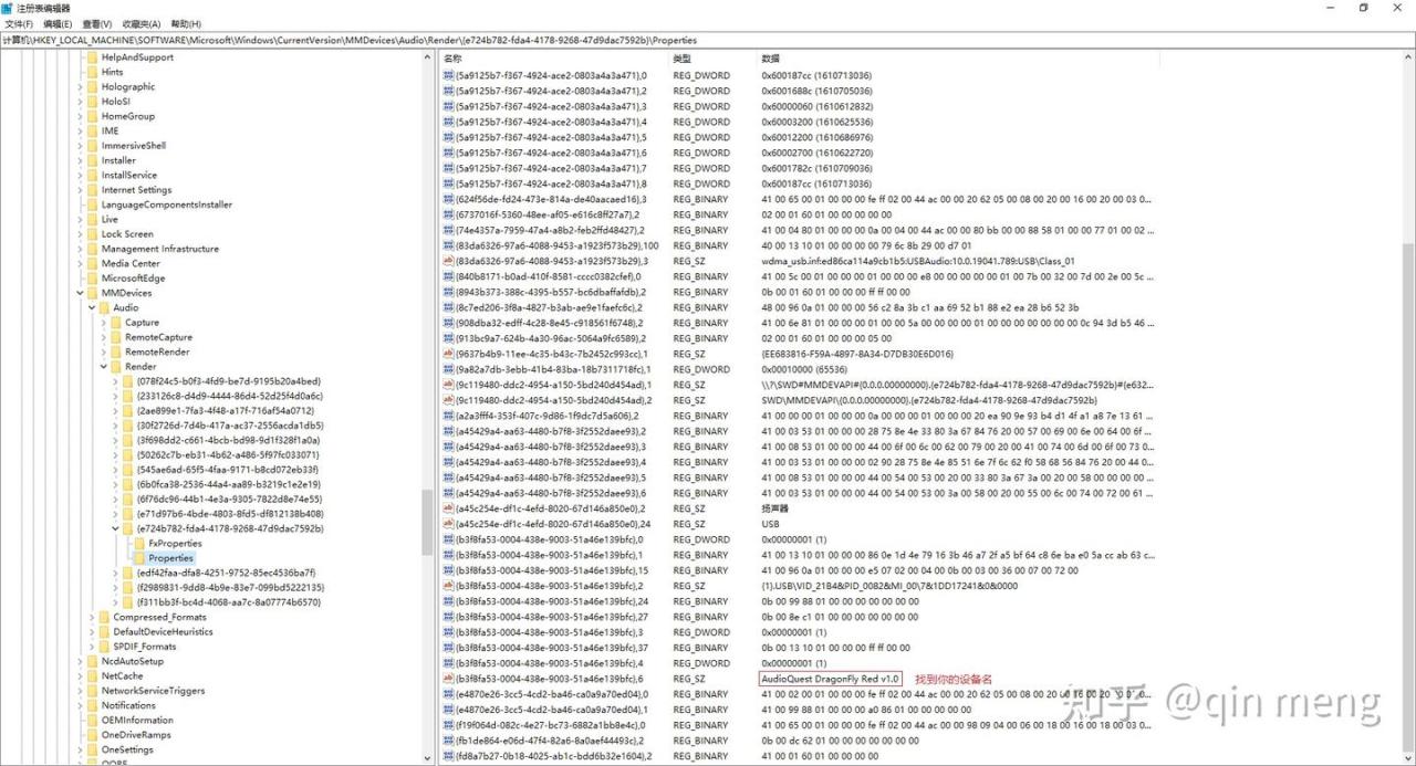 这里面是你的所有回放设备,用CLSID标识,你需要现找到你正在用的设备,一般比较好找,注意Properties选项右侧相关键值里面的回放设备名称即可,比如: