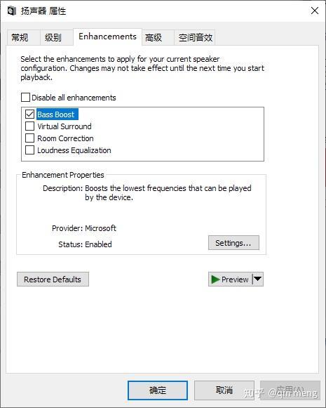 如果你的回放设备驱动中,厂商没有指定任何默认的APO,那么你就看不到这个增强页面了。所以实际上这个问题实际上是厂商驱动的锅。好了,这个问题搞清楚了,等下说解决方法。下一个问题是这个Bass Boost选项怎么没了,Bass Managment又是什么鬼?