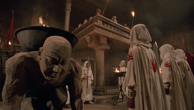 而後者,則可以從宗教行爲中辨別。“拜火”正是絲綢之路上粟特商旅的信仰特徵,而神廟鏡頭中的帶翼塑像,也與“拜火教”神像的造型相契合。