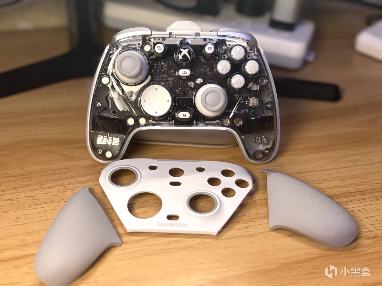 先來看看外觀,非常標準的Xbox佈局,聽名字也可以猜到,它的模具其實是根據G7改進而來,不過我沒有使用過它的前代產品,所以具體哪些變化,就不清楚了,我單純來講講我的感受,首先就是面殼方面,是磁吸的設計,但是相比起一般手柄的磁吸面殼,它居然做了個分段處理,握把和主體的面殼是分開的,全部拆開之後,會看到內部透明的電路板,你別說,還挺帥的。就是不知道後續會不會推出像超新星那樣的可替換面殼。