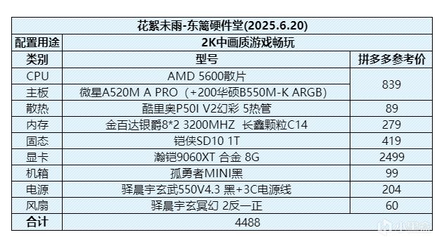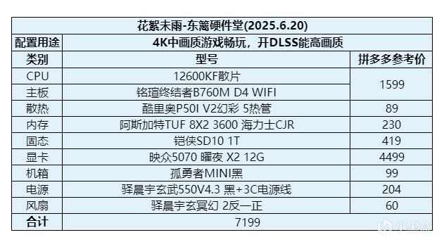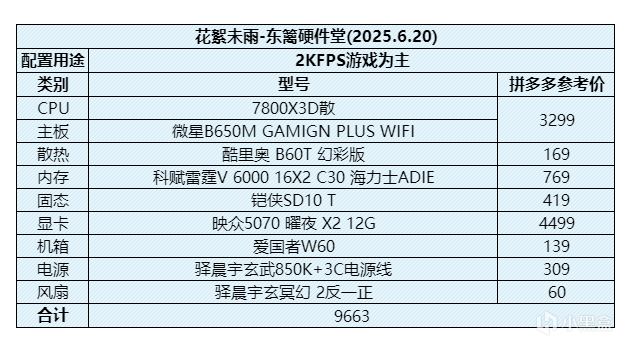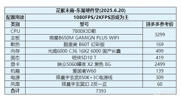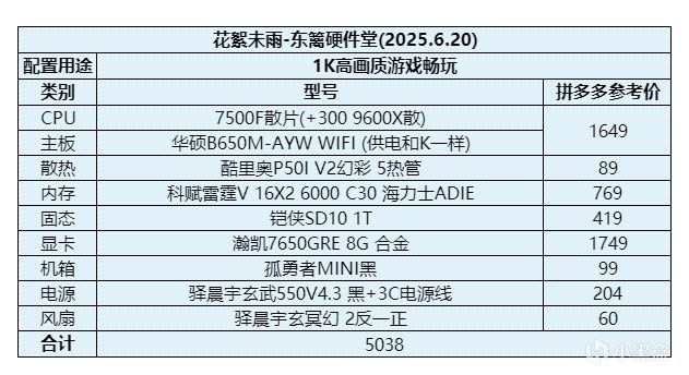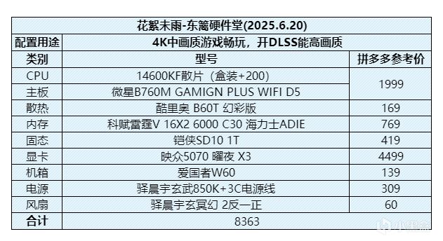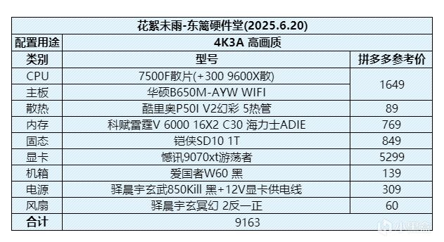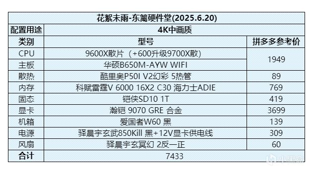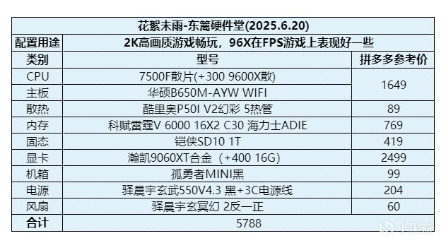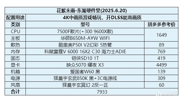 本預算內帶來6套,若考慮以後4K升級的話CPU可以用9600X。9600X在往上的CPU對3A4K提升就不大了,FPS爲主則可以考慮7800X3D那套。