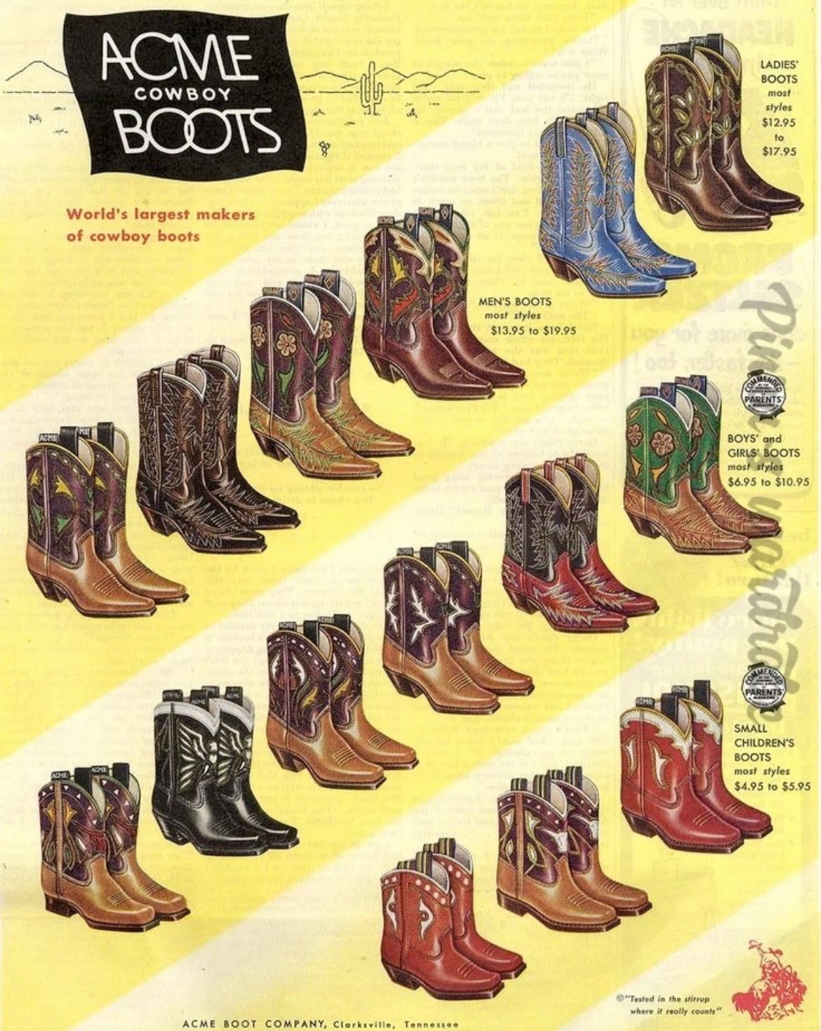 牛仔靴诞生于特殊的西部环境下,牛仔们需要骑马,防荆棘剐蹭,防响尾蛇袭击,所以设计成加高,加厚,鞋跟倾斜易挂住马蹬,后跟可安装马刺等,现在已进化的非常成熟。