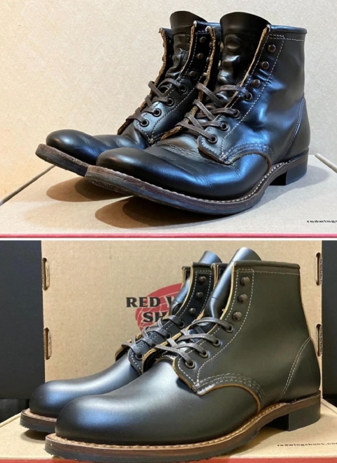 大名鼎鼎的贝克曼靴,为致敬红翼第四代掌门人贝克曼设计,为数不多可以搭配正装的工装靴,想到有兄弟可能有正装需求,所以放在这里特别介绍一下。老版本是茶芯皮,而且腩皮概率极高,所以不推荐,建议新版本,9419,9422,9423。鞋头无支撑,旧化效果很特别。