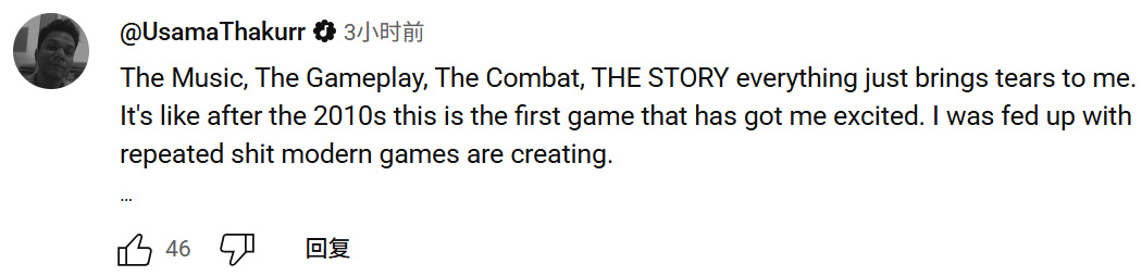 “音乐、玩法、战斗、剧情……一切都让我热泪盈眶。这是2010年代后首款让我如此兴奋的游戏。受够了现代游戏的陈词滥调,这将是给业界的一课”