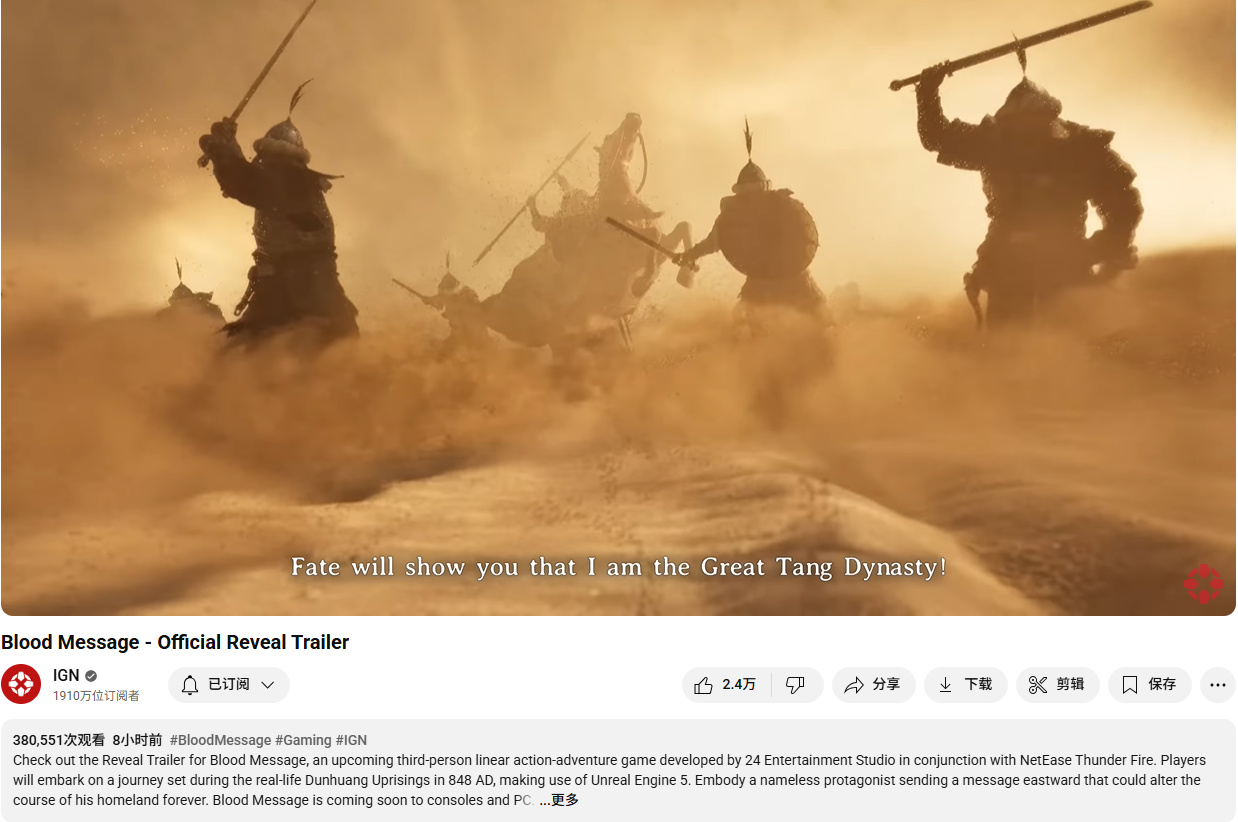 值得一提的是,IGN今日也发布了《归唐》的预告片,截至发稿播放量已达38万,国外玩家对本作格外期待,并充满了赞美之词。
