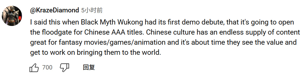 “当初《黑神话:悟空》首曝时我就说过,它将开启中国3A大作的闸门。中国文化拥有取之不尽的奇幻题材宝库,现在正是它们被发掘并推向世界的时机”