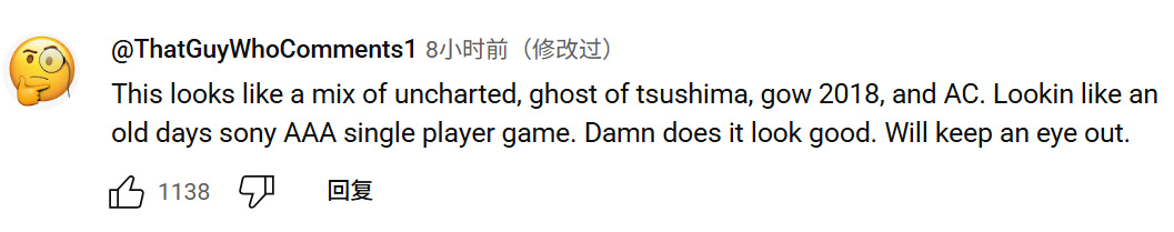 “这游戏像是《神秘海域》《对马岛之魂》《战神2018》和《刺客信条》的融合体,颇有索尼经典3A单机大作的质感。太惊艳了,必须重点关注”