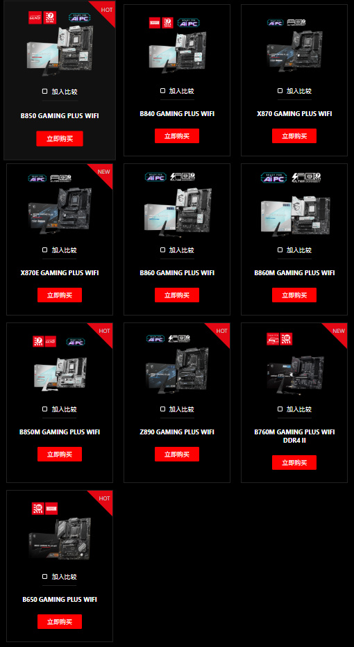 這個系列比較特殊,由於產品線較少,定位比較模糊,用於填補以上產品線的之間的差異化不足,AMD、英特爾平臺都有,B板Z板也都有,ATX大板,MATX小板也俱全,但是型號覆蓋的很少,大家可以簡單看看。