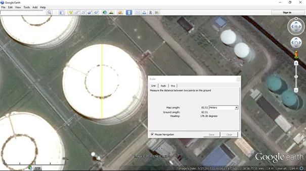 若缺乏這類信息,不妨嘗試尋找罐體側面實景照片 —— 比如在衛星地圖上(如Google Earth)獲取油罐的側拍圖。