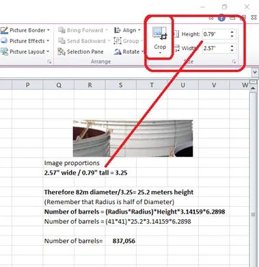 將照片導入電子表格並裁剪出罐體前緣區域,通過比例換算即可推導實際高度。例如某照片中罐體顯示寬度爲 2.57 英寸、高度爲 0.79 英寸,已知該油罐實際直徑爲 50 米,可按 “實際直徑 ÷ 照片寬度” 得出比例係數(50 米 ÷2.57 英寸≈19.46 米 / 英寸),再用係數乘以照片高度(19.46×0.79≈15.37 米),即可估算出罐體實際高度約爲 15.37 米。