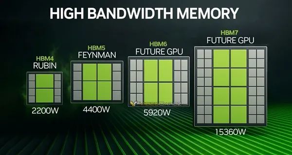 Feyman之后下一代2032年推出,单芯片面积缩小到700平方毫米,但是功耗突破1000W,而且通过四芯整合封装,中介层超过6000平方毫米,搭配多达16颗HBM6,带宽256TB/s,整卡巩固好近6000W。