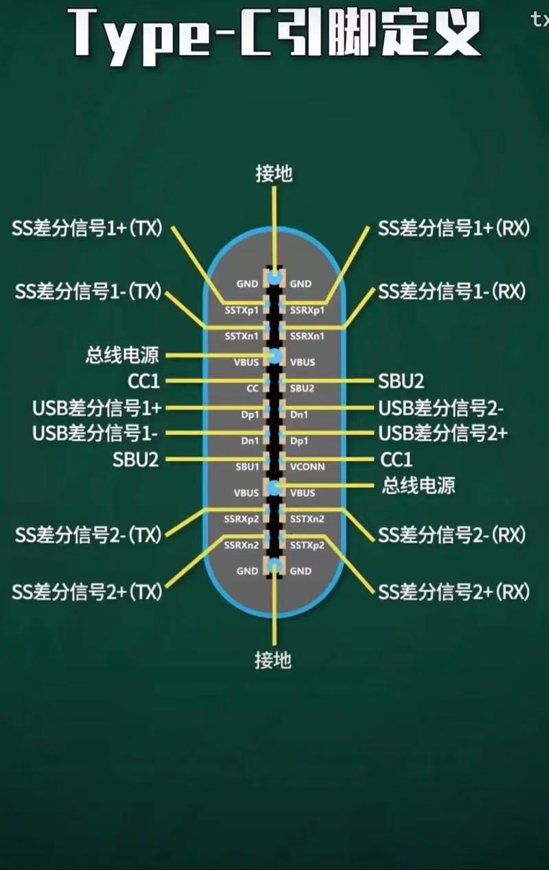 而TypeC接口之所以有如此高的性能,主要还是归功于它的24个接头引脚,你没有听错,microB有5个接头引脚,TypeC足足有24个接头引脚,它们分别是4对TX/RX分线,2对USBD+/D-,1对SBU,2个CC,另外还有4个VBUS和4个地线。