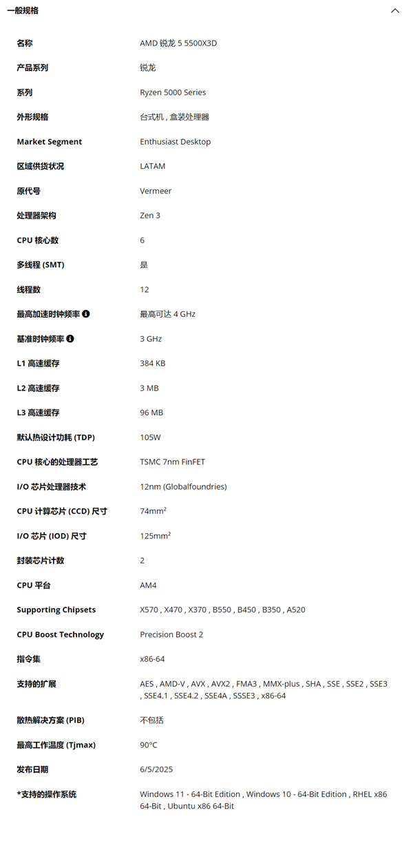 但和锐龙5 5600X3D一样,5500X3D应该也是一款特供CPU,根据AMD官网上的销售代码“LATAM”可知,该处理器应该是特供拉丁美洲。