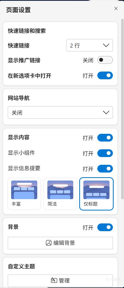 最后的界面是这样的,我们可以在快速链接里面添加自己平时常用的网站,如果一行不够用,可以在“页面设置”的快速链接改为2行,现在我们的Edge就基本完成了,还有一步~