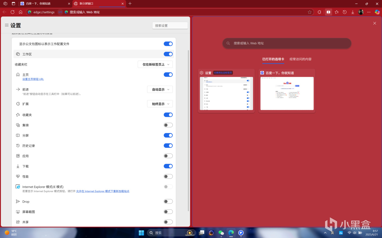 “分屏”开启,点了分屏之后是这样的,“历史记录”开启,方便浏览历史网站,“下载”点开,这些所有选项开启后,都会出现在浏览器的右上角那一栏,“主页”在左上角。