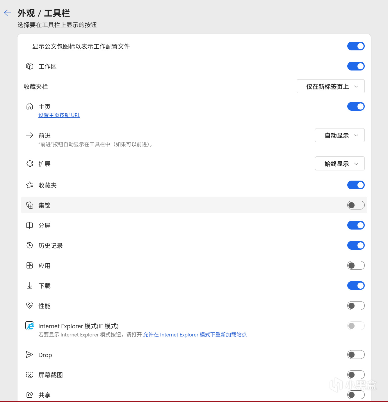 往下划,点开“工具栏”,这里面需要调试的设置还不少,首先把“主页"开启,“拓展“从“自动显示”改为“始终显示”,如果平时有很多网站收藏需求,“收藏夹“开启,