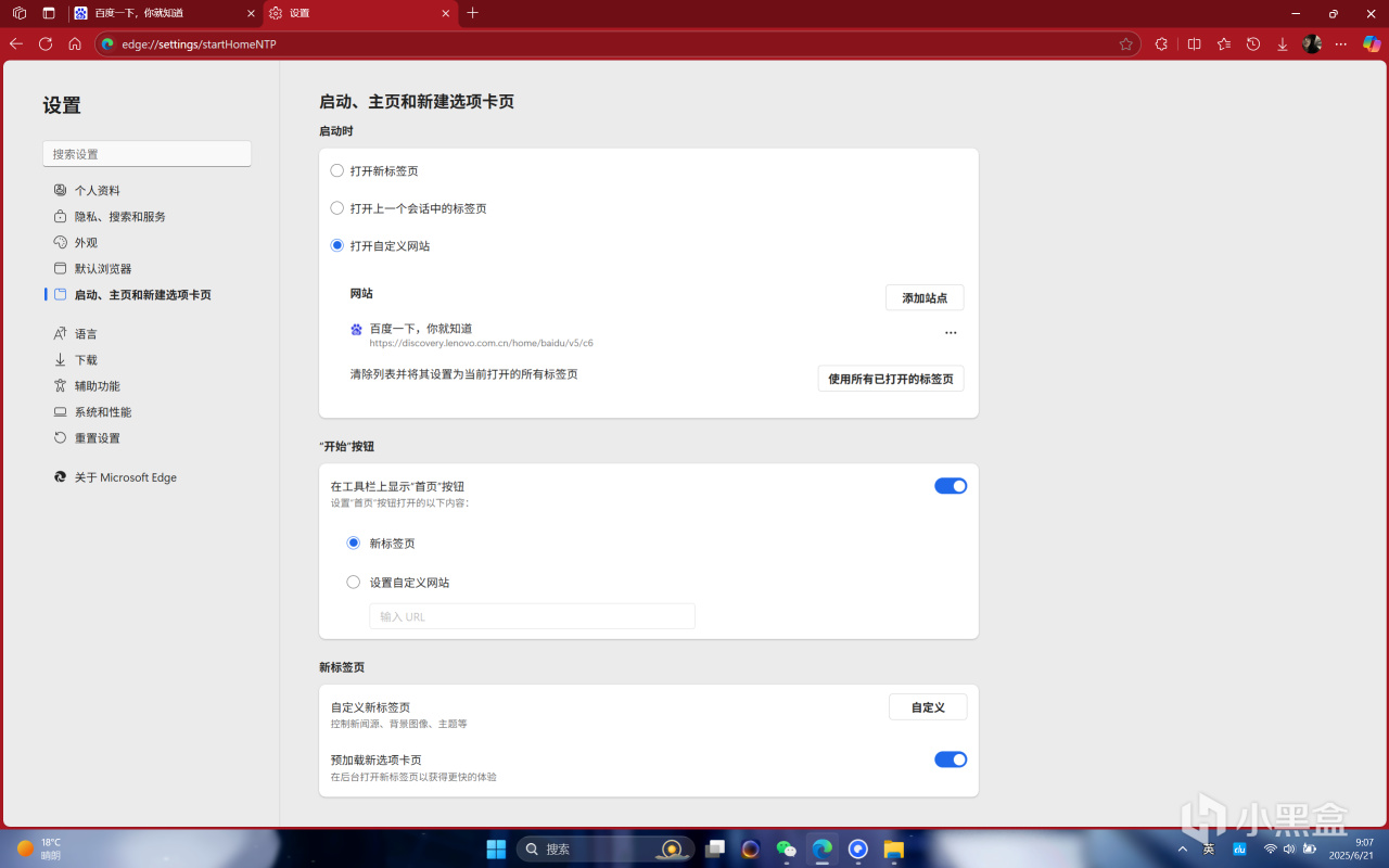然后,点击“启动、主页和新建选项卡页”,可以看到,我们启动项的默认设置是“打开自定义网站”,并且网站下面是百度,我们更改成“打开新标签页”,