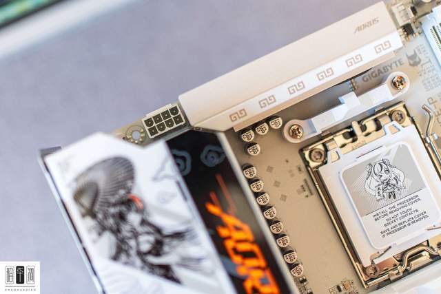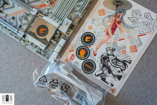 ▼主板外形相当亮眼,纯白基底承载着飘逸的水墨山水画,并巧妙地融入了橙色元素作为点缀,将古典意蕴与科技美学和谐统 一。左上角身着旗袍、手持雨伞的 AORUS 雕妹形象,更是为产品增添了独特的 二 次元国风魅力。