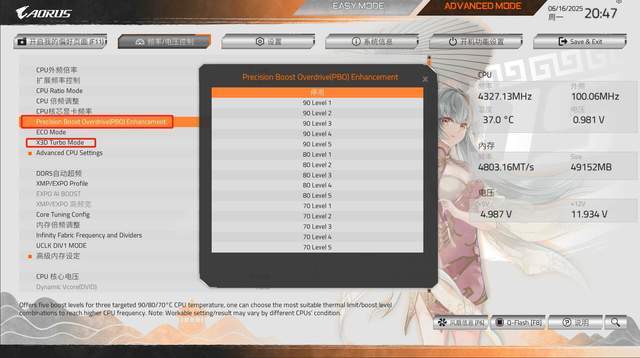 ▼技嘉针对 AMD 平台提供了 【PBO Enhacement】和【X3D Turbo Mode】优化方案,前者能实现 一 键超频 CPU,拥有 15 个档位可调,后者则能通过调整 CPU 核心频率、带宽和硬件功率提升游戏性能表现,配合高端显卡更能大幅提高游戏帧率。