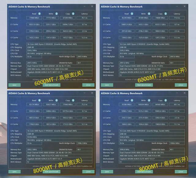 ▼AMD 平台比较吃内存效能,所以甜品区间在 6000MT/s ~ 6400MT/s 之间,再往上就是分频模式,内存测试分别进行了 四 轮,分别为两种 EXPO 预设,对比开启技嘉主板的高频宽功能。