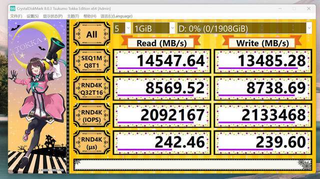 ▼硬盘测试选用最近入手的威刚翼龙 S150,这是款采用慧荣 SM2508 主控与 SLC 有缓机制的 PCIe 5.0 固态硬盘,实测顺序读写速度分别为 14547 MB/s 和 13485MB/s,已逼近 PCIe 5.0 x 4 接口的理论带宽上限,展现出主板强悍的存储性能。
