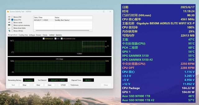 ▼最后看看功耗和散热,不手动提升频率的情况下 AIDA64 FPU 压测 10 分钟,9950X3D 核心频率 4561MHz,CPU 稳定功耗在 184W 左右,处理器温度 95°C,主板温度 47°C,感觉水冷没接触好,正常来说 CPU 不会有这么高温度。