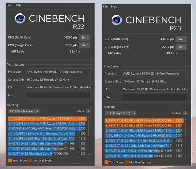 ▼Cinebench R23 渲染测试:作为衡量专业生产力性能的标杆,9950X3D在本平台取得了单核 2185分、多核 40280分 的成绩