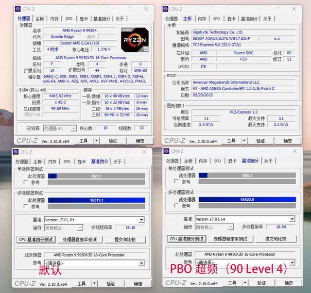 ▼CPU-Z 基准测试:在这块战技嘉雕妹 B850M 上,9950X3D跑出了单核 851.1,多核 16311. 的分数。而在开启 PBO 超频(90 Level 4)后,单核 上升至 888.3分、多核上升至,16822.9分,