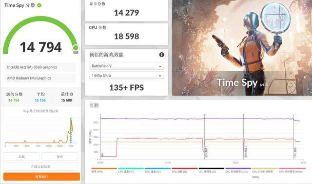 ▼游戏方面没有做过多测试,毕竟 B580 的性能也就和 RTX4060 差不多,3DMark Time Spy 总分 14794,显卡分数为 14279,CPU 分数为 18598。