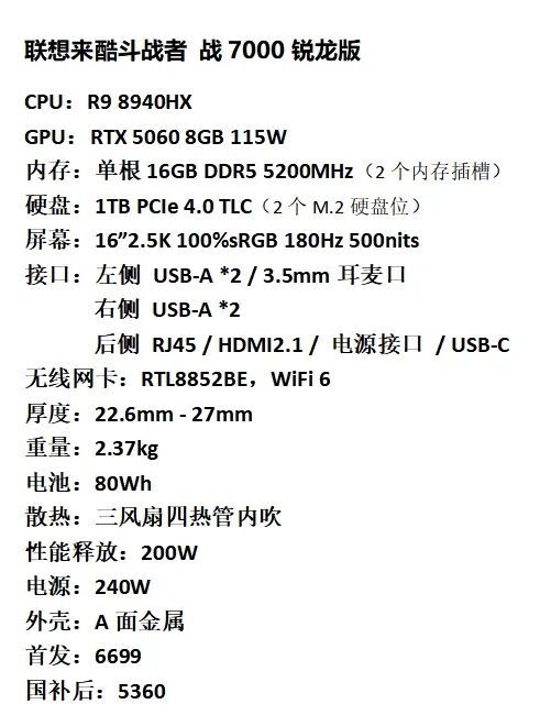 R9 8940HX + RTX 5060 + 2K 180Hz,仅A面金属,首发国补后5360元。