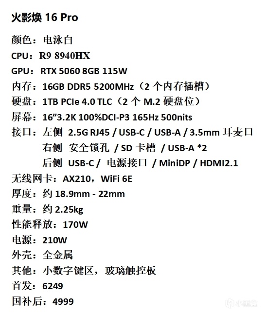 这是火影 焕16 Pro的配置与价格,