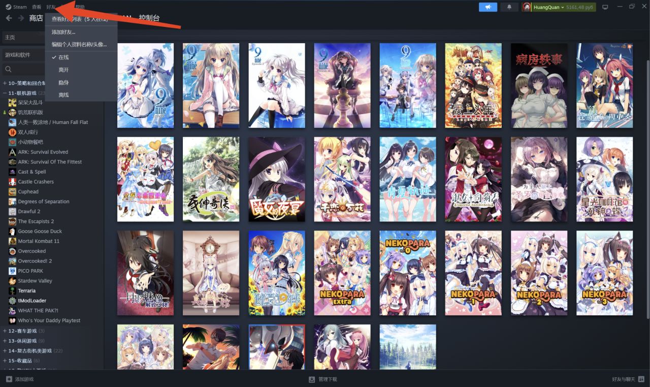 在steam主页点击左上角好友,点击离线就是转换成离线模式了