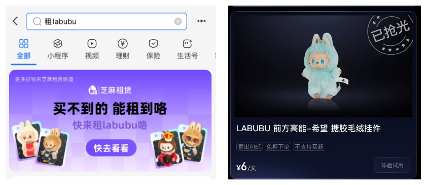 点开你的支付宝,就能在芝麻租赁里直接租到 Labubu ,现在最火的 3 代大概 6 块钱一天。