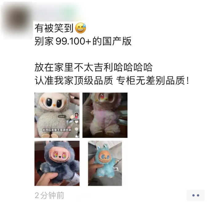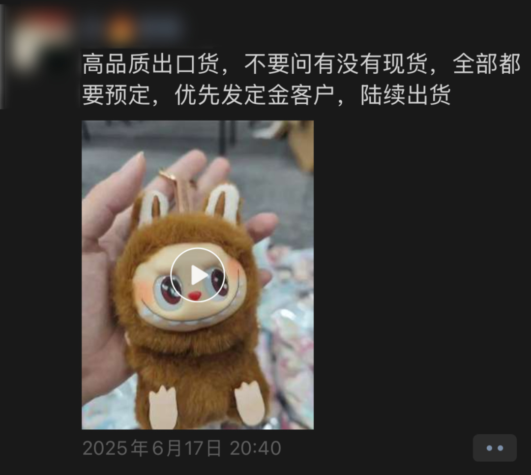 世超朋友圈里,不管之前是卖什么的,只要认识点广东、义乌的人,都开始卖 Labubu ( 顶级品质专柜无差别 )。