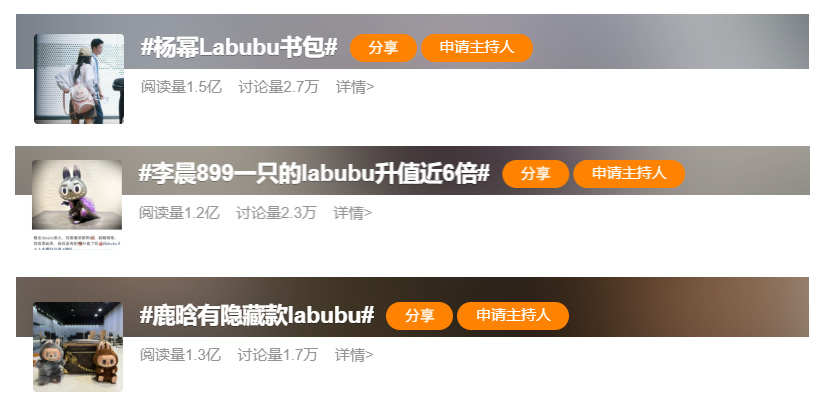 明星 + Labubu 的词条,基本都是上万讨论量,上亿阅读量。