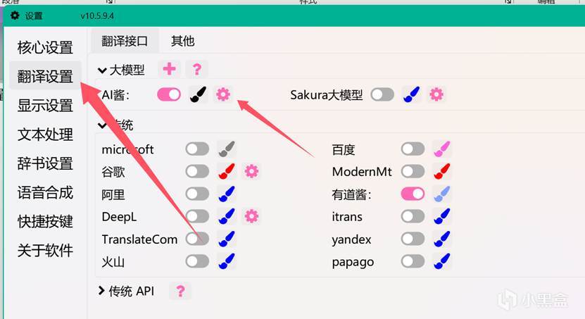 点击左侧翻译设置,选择大模型列表第一个的齿轮