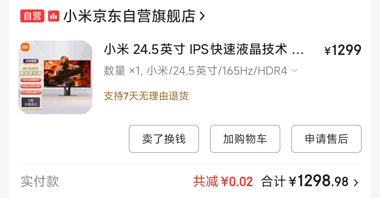 考虑到财力有限,就没敢奢望2000多元的34寸带鱼屏了。我选择了价格更低些的小米24.5寸快速液晶显示器,1299元,色彩还行,165HZ,无论是玩单机大作还是FPS都够用,也一直留到现在。