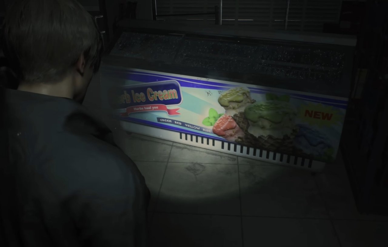 在“Herb”(草藥)冰淇淋販賣櫃上,有紅色、綠色和藍色三色以及4代出現的黃色的幾種冰淇淋,就和《生化危機》裏的傷藥顏色一樣。