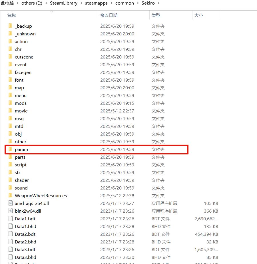 解包后的只狼主文件夹,找到sekiro\param\GameParam\gameparam.parambnd.dcx文件,复制到mods文件夹中:sekiro\mods\param\GameParam\gameparam.parambnd.dcx这个gameparam.parambnd.dcx就是我们后面主要的修改文件。