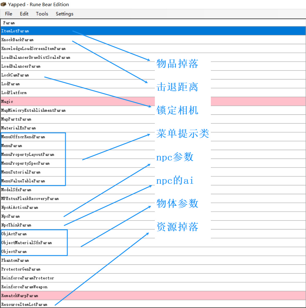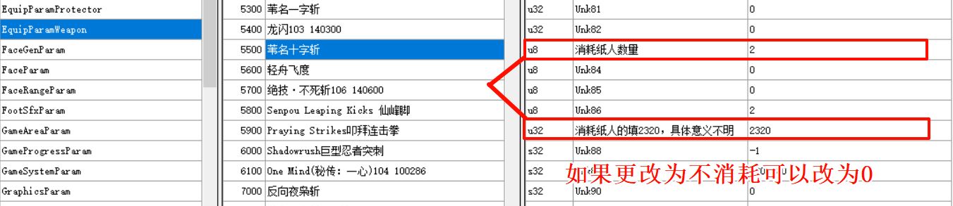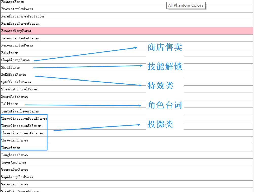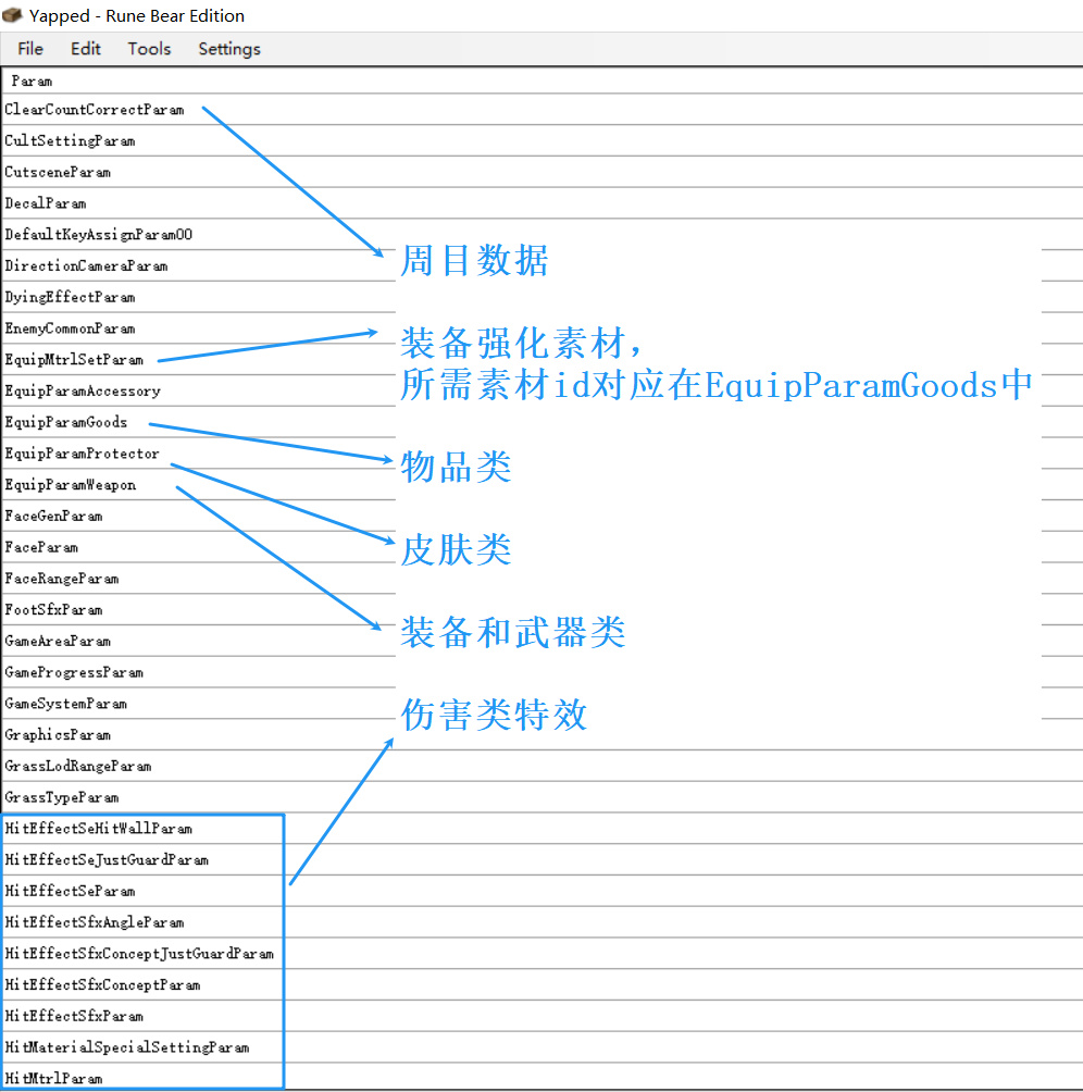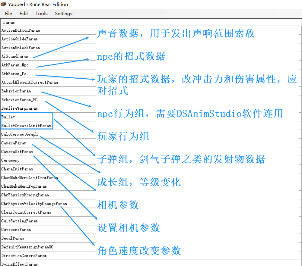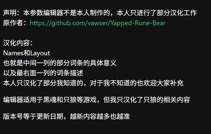 《黑暗之魂》《只狼:影逝二度》《艾尔登法环》参数文件的编辑器,用于确定物品、攻击、效果、敌人、对象等的属性。词条是全英文版。适合熟悉只狼文件命名进行词条定位。