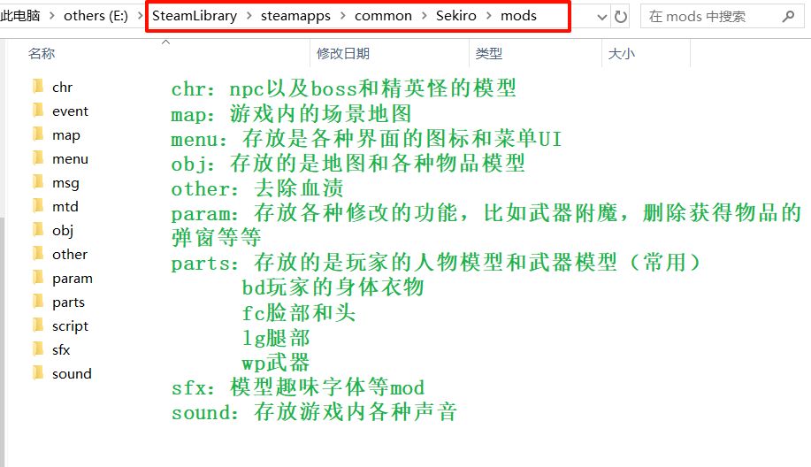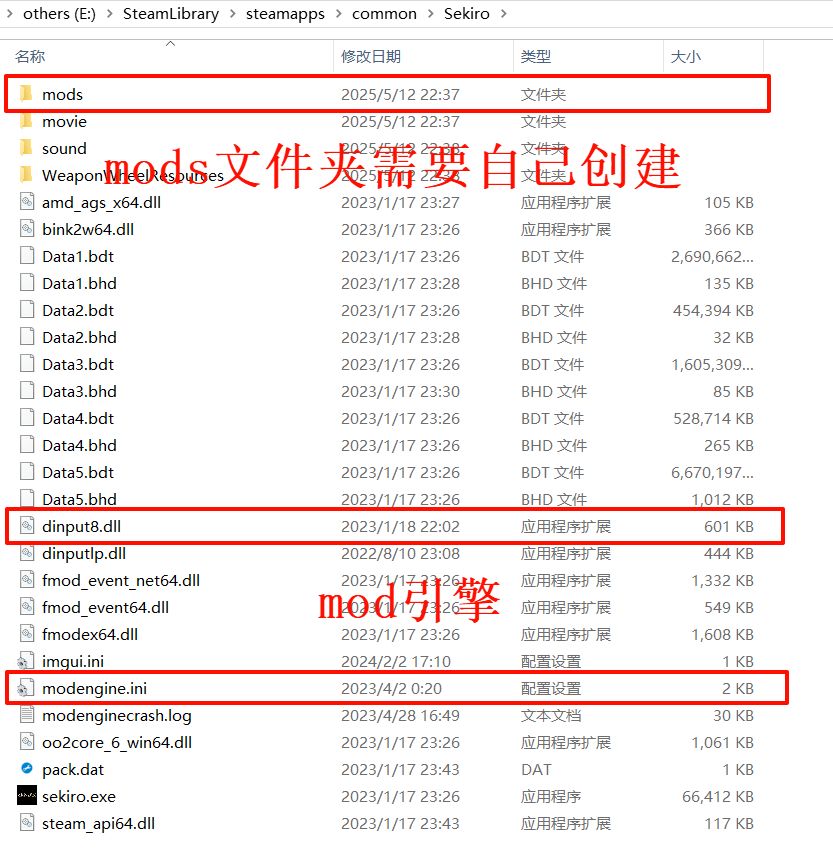 需要注意的是,mod引擎只有dinput8.dll和modengine,直接复制到sekiro主目录文件夹中即可,mods文件夹需要自己创建。