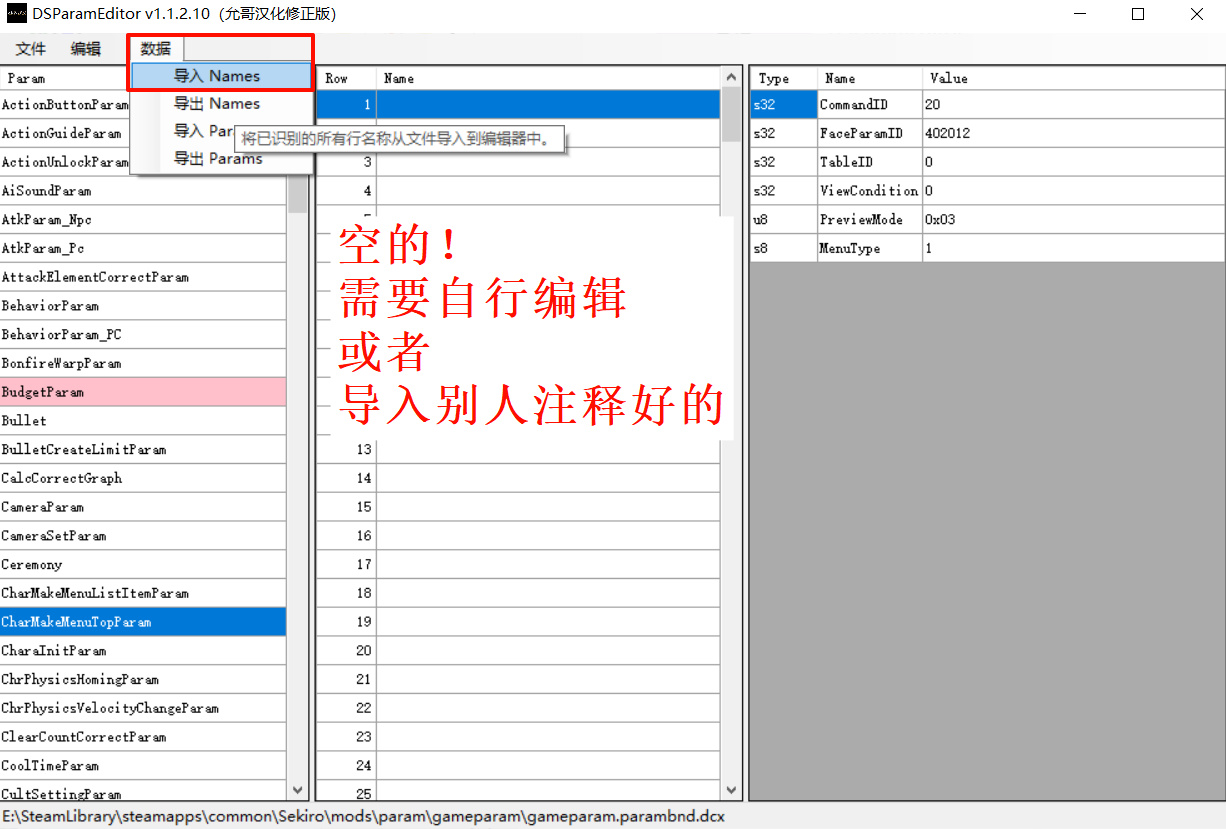 DSParamEditor需要找一份已经注释过的gameparam.parambnd.dcx文件导出Names后再导入需要注释的param文件。(比如别人已经改好的mod)